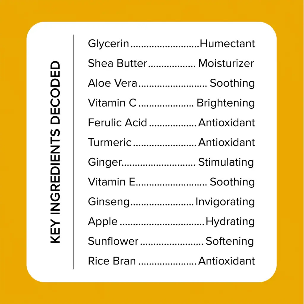 Aqua, Glycerin, Cetyl Alcohol, Dimethicone, Butyrospermum Parkii (Shea Butter), Tetrahexyldecyl Ascorbate (Vitamine C), Curcuma Longa (Turmeric), Niacinamide, Tocopherol (Vitamine E), Extrait de Ginseng, Extrait de Gingembre, Panthenol, etc.